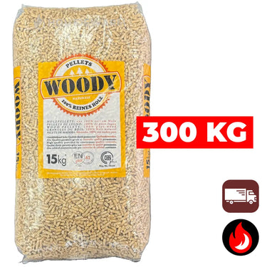 De Woody Premium pellets zijn verpakt in 15 kg zakken – in totaal 20 zakken (300 kg). Ideaal voor wie minder opslagruimte heeft, voor tussentijds bijbestellen of om deze pellets eerst te proberen.